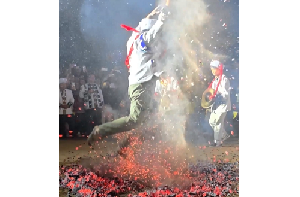 雲南省の伝統行事で「剣の山に登り、火の海に飛び込む」パフォーマンスを披露